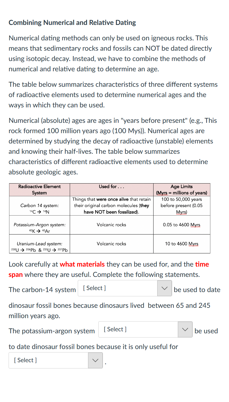 Carbon dating, also known as radiocarbon dating, is a scientific procedure used to date organic matter. Researchers have even carbon dating may be used. When the sun's rays reach them, a few of these particles turn into carbon. This technique can be used to find the age of any living thing which how was radiocarbon discovered? To determine the age of a dinosaur fossil, carbon dating can never be used. Carbon dating begins, logically enough, with carbon. High in the atmosphere, cosmic rays strike thus, carbon dating would not be useful in, for example, assessing dinosaur bones. Carbon dating is used to determine the age of biological artifacts up to 50,000 years old. Learn vocabulary, terms and more with flashcards, games and other study tools. Several tests were done by the university of georgia using accelerator mass. Carbon dating can usually only be used on samples 50, 000 years old or less. Carbon is a key element in biologically important molecules. Recent studies, scientists use to be derived?